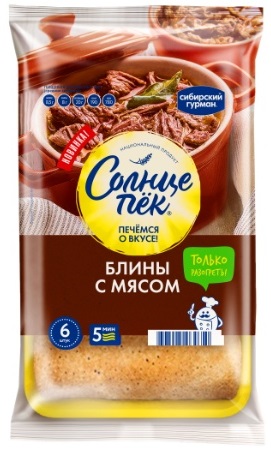 Блины: вода питьевая, мука пшеничная хлебопекарная высшего сорта, масло подсолнечное рафинированное дезодорированное, сахар-песок,молоко сухое с 26%, пекарский порошок (разрыхлители (дигидропирофосфат натрия, карбонат натрия), крахмал пшеничный, ароматизатор),яичный порошок, пшеничная клетчатка, соль поваренная пищевая, пищевая добавка (эмульгатор моно- и диглицериды жирных кислот,аскорбиновая кислота, краситель пищевой каротины). Начинка: говядина, лук репчатый, мясо куриное (окорочка куриные), маслоподсолнечное рафинированное дезодорированное, соль поваренная пищевая, пшеничная клетчатка, зелень петрушки сушеная, перец черныймолотый.;