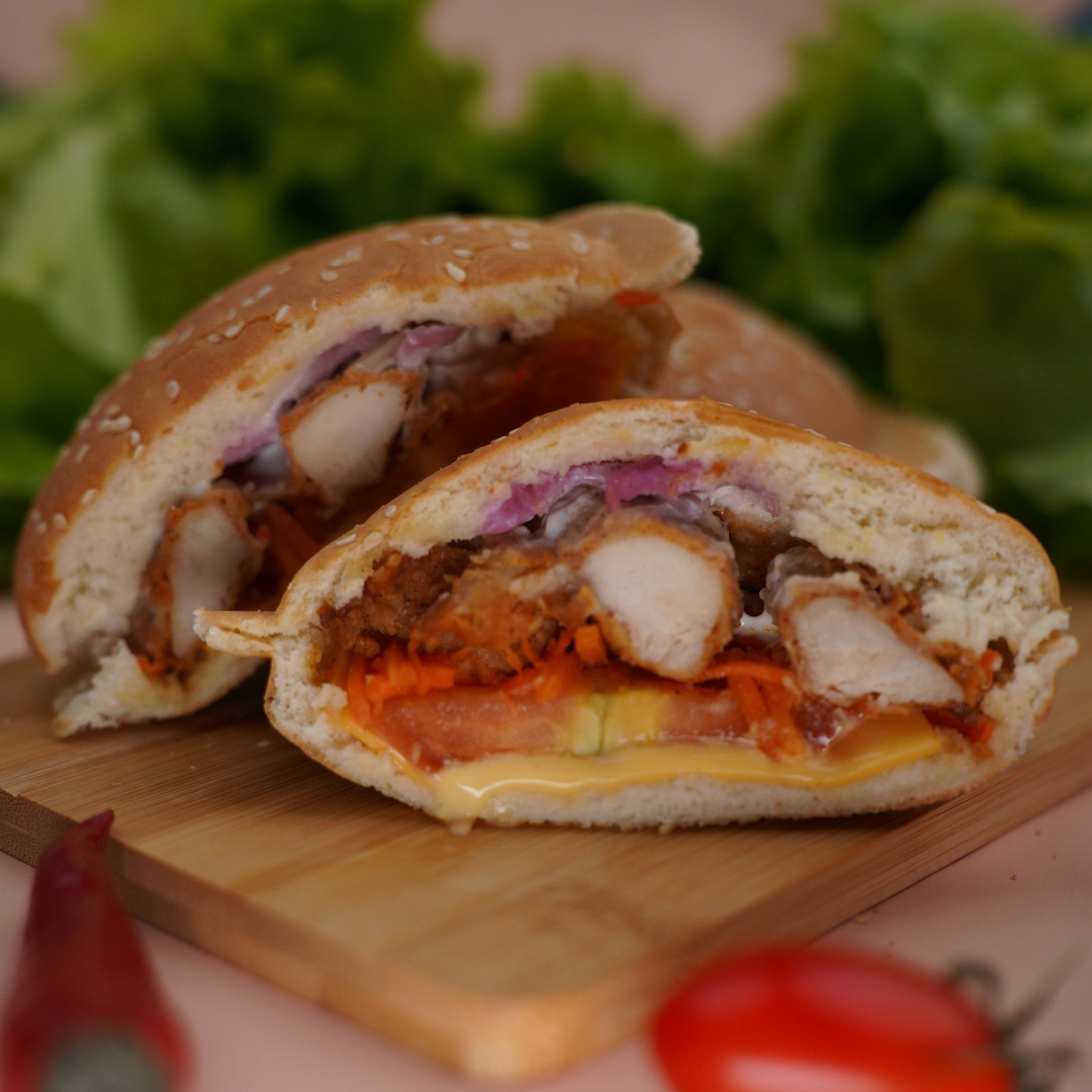 Булочка для гамбургера, филе куриное, помидоры свежие, морковь свежая, лук красный репчатый, соус чесночный, сыр хохланд, соус кимчи, мука пшеничная, сухари панировочные, соль пищевая поваренная, сахар, уксус.;