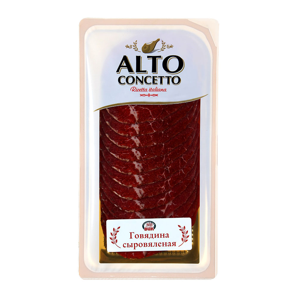 Говядина Alto Concetto сыровяленая 100 г. Для приготовления используется постная говядина, соль и специи. Только при строгом соблюдении правил и сроков хранения проходит процесс ферментации, благодаря которому она приобретает насыщенный темно-красный цвет и свой уникальный вкус. Великолепное сочетание цельного куска говядины и тщательно подобранной смеси перцев, пряностей, мускатного ореха и лавра обеспечило этому деликатесу большое количество поклонников.