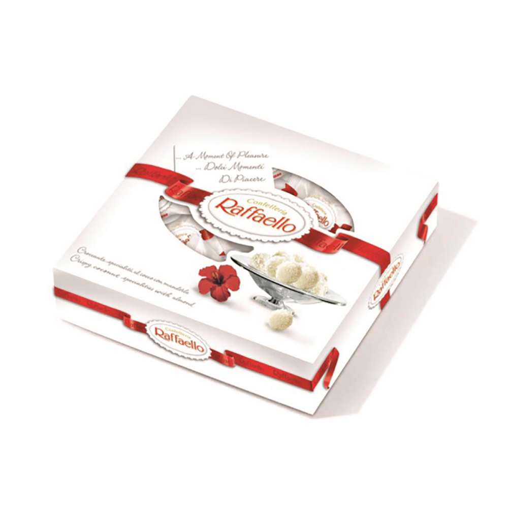 Конфеты Raffaello (Раффаэлло) состоят из двух тонких вафельных половинок с мягким кокосовым кремом внутри и цельным миндальным орехом, который тщательно очистили и обжарили. Сверху их покрывают кокосовые хлопья, придающие конфетам оригинальную и аппетитную форму.