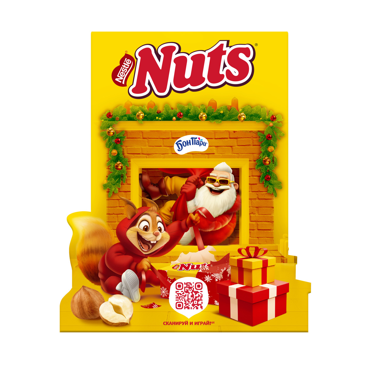 1.Бон Пари: патока, сахар, вода, желатин, регулятор кислотности (лимонная кислота), концентрированный яблочный сок, масло пальмовое, ароматизаторы натуральные, глазирователь (воск карнаубский), красители (антоцианы, экстракт паприки, медные комплексы хлорофиллинов, куркумин); 2.Бон Пари Дуо. Роял корги: патока, сахар, желатин, вода, регулятор кислотности (лимонная кислота), концентрированный яблочный сок, масло пальмовое, ароматизаторы натуральные, глазирователь (воск карнаубский), сироп карамельный, красители (антоцианы, экстракт паприки, куркумин); 3.Nuts Конфета: сахар, патока, жир специального назначения (из пальмового масла), молоко сухое обезжиренное, фундук целый, какао тёртое, масло какао, сыворотка молочная сухая, молочный жир, эквивалент масла какао (масло пальмовое, масло ши), белок яичный сухой, эмульгаторы (лецитины, Е476), арахис, молоко сухое цельное, ароматизаторы натуральные, регулятор кислотности (лимонная кислота), соль; 4.Nuts Космический:сахар, патока, жир специального назначения (из паль;