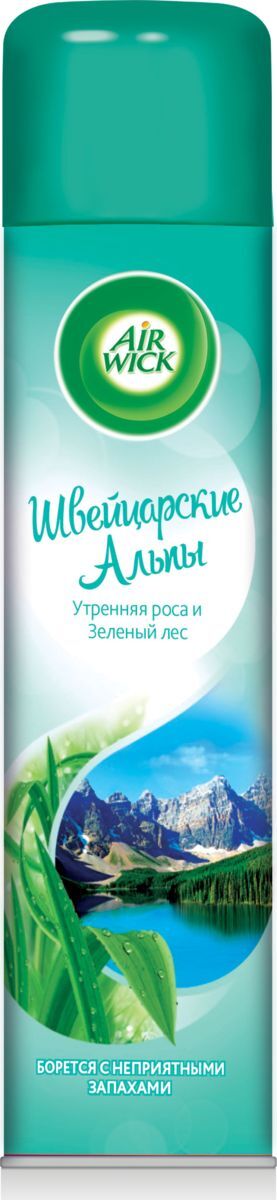 Освежитель воздуха AIR WICK Швейцарские Альпы из новой коллекции Ароматы мира эффективно борется с неприятными запахами, оставляя аромат горного воздуха, наполненного свежестью утренней росы и зеленого леса.