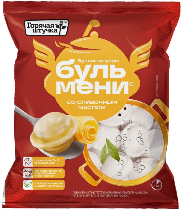 Мука пшеничная хлебопекарная высший сорт, вода питьевая, говядина, мясо цыпленка-бройлера механической обвалки, лук репчатый свежий,бульон говяжий, масло сливочное (пастеризованные сливки), соевый белок, свинина, молочная сыворотка, масло растительное, соль, белокживотный (свиной, говяжий), пшеничная клетчатка, загустители (каррагинан из водорослей euchema, гуаровая камедь, конжак),разрыхлитель – пирофосфаты, антиокислители (аскорбиновая кислота, лимонная кислота), сахар, пряности и экстракты пряностей (в томчисле горчица, сельдерей).;