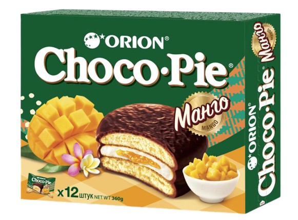 Мука пшеничная, сахар, вода питьевая, патока, жир кондитерский, масла, эмульгатор, антиокислители (Е319, лимонная кислота)),фруктовый наполнитель Манго (сахар, манго, глюкозный сироп, глюкоза, вода питьевая, загустители, лимонная кислота, цитрат натрия3-замещенный, цитрат кальция 3-замещенный, антиокислитель (аскорбиновая кислота), краситель (лютеин), консервант (сорбат калия),эмульгатор (Е475)), жир специального назначения, эмульгаторы, молоко сухое цельное, яичные продукты, какао-порошок, лактоза,влагоудерживающие агенты (сорбитовый сироп, глицерин), разрыхлители (гидрокарбонат аммония, гидрокарбонат натрия, ортофосфат кальция1-замещенный), глюкоза, желатин пищевой, соль, какао тертое, ароматизаторы, молочный белок.;