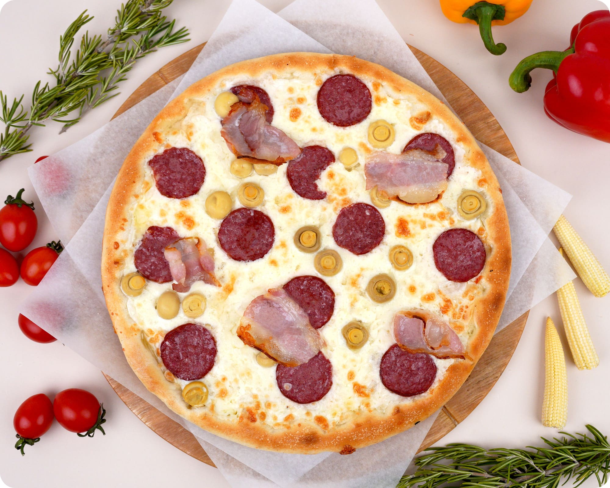 Тонкое тесто и вкусный сливочный соус , в сочетании с беконом, колбасой, красным луком и сыром моцарелла.