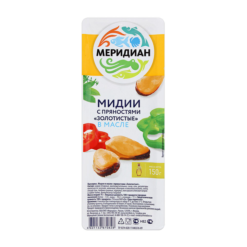 Мидии МЕРИДИАН Золотистые в масле с пряностями 150г