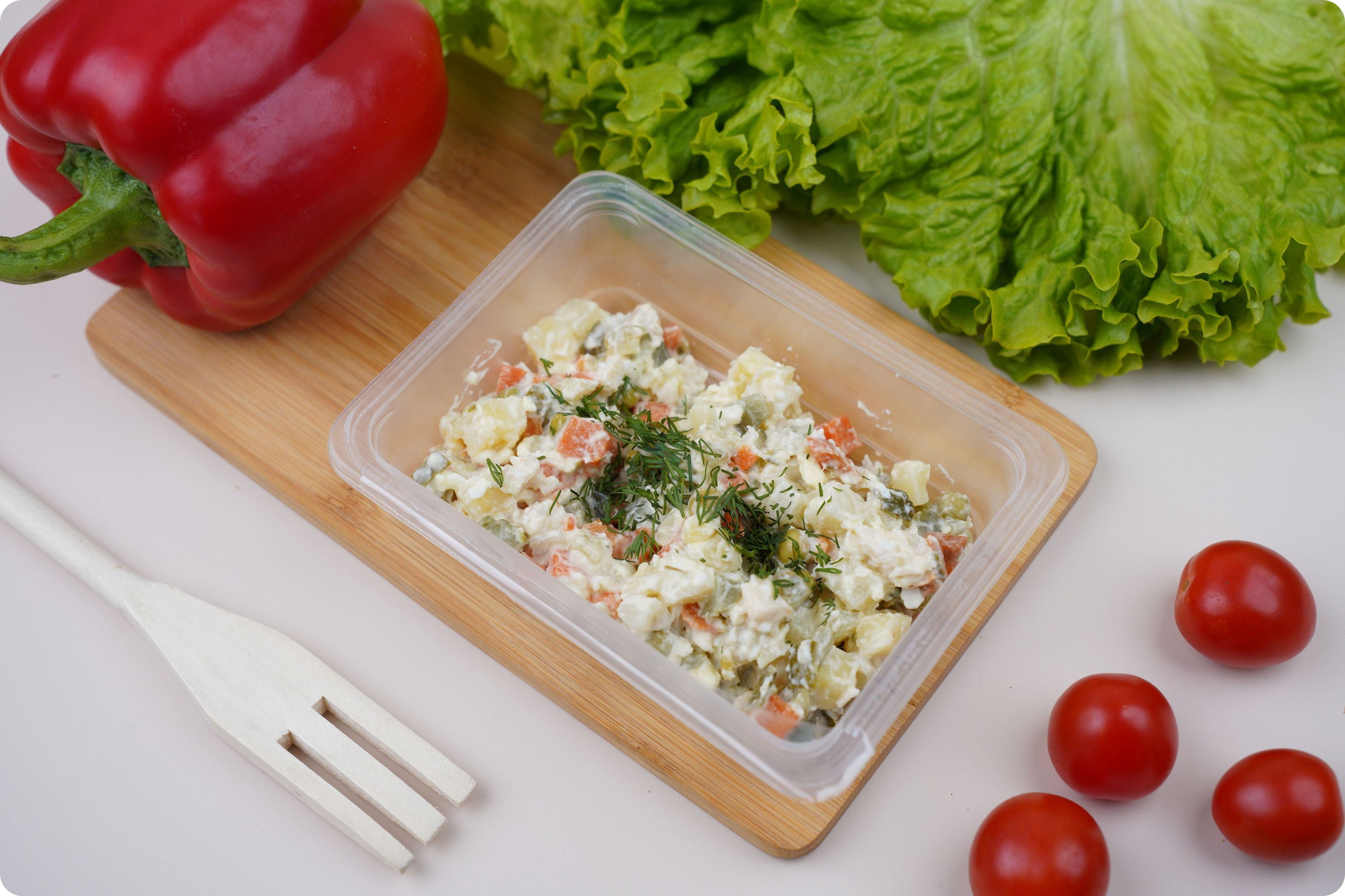 Картофель,куриное филе,морковь,огурцы маринованные, яйцо куриное, горошек зеленый консервированный, майонез, лук репчатый свежий, соль пищевая.;
