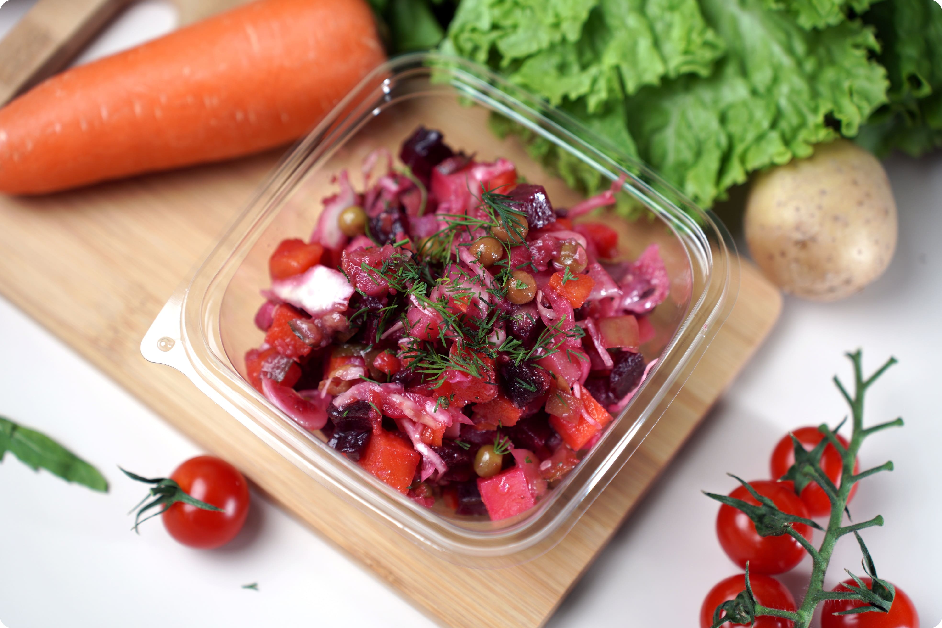 Картофель , морковь , свекла, огурцы консервированные, капуста белокачанная, горошек зеленый консервированный, масло растительное рафинированное, дезодорированное, соль поваренная пищевая, уксус столовый.;