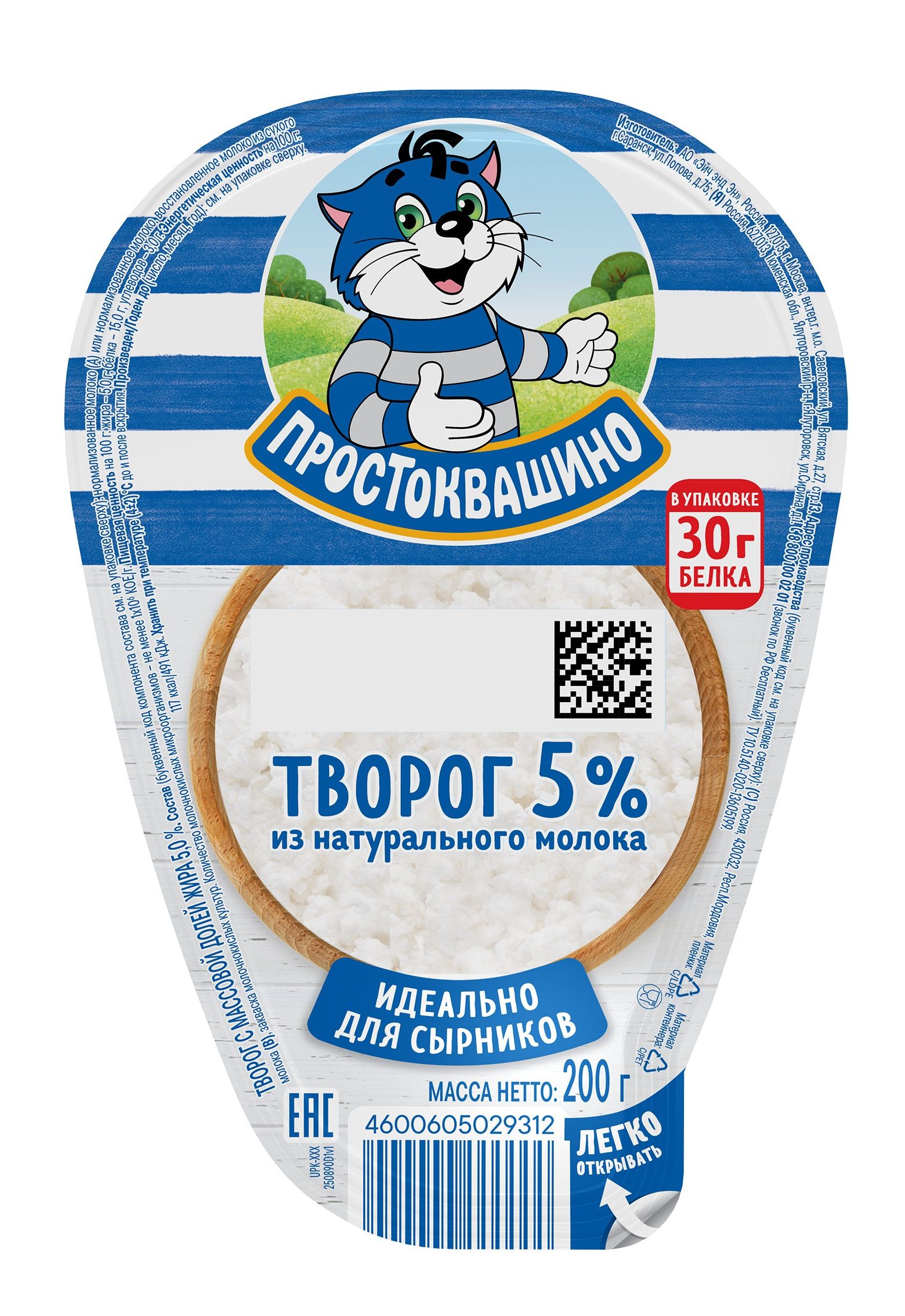 Творог Простоквашино 5% приготовлен по особой технологии из пастеризованного молока и закваски молочнокислых культур. После свертывания из творога отделяется сыворотка, продукт помещается под пресс и затем охлаждается. Структура получается плотная, суховатая, с минимальной кислинкой. Такой творог хорошо подходит для приготовления сырников и запеканки.