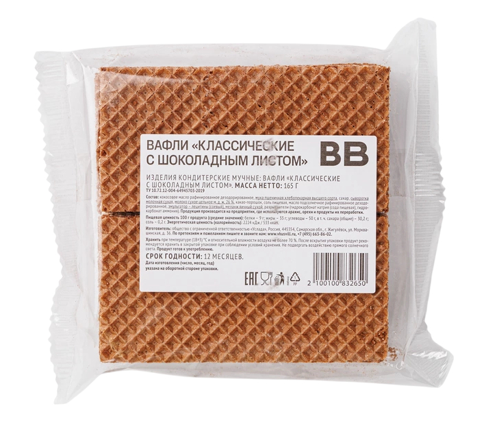 Вафли ВкусВилл Классические с шоколадным листом 165г