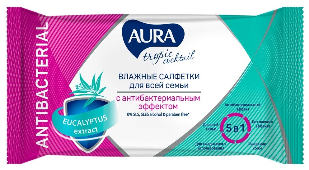 Салфетки влажные AURA Tropic Cocktail с антибак эффектом 15шт