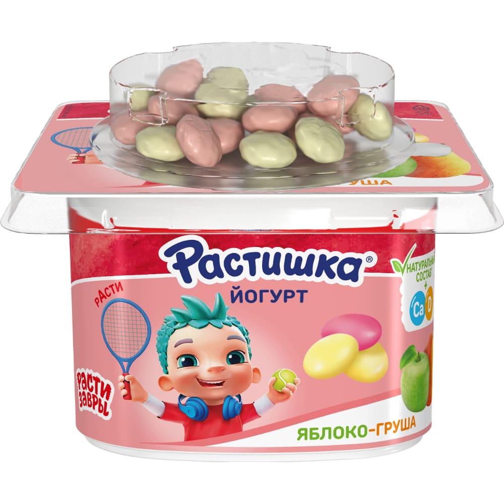 Йогурт Растишка Яблоко-груша с печеньем в шоколаде рекомендуется для детей старше 3х лет. В продукте только натуральные ингредиенты плюс кальций и витамин D3, необходимые для здорового роста и развития малыша. Печенье сделано из пшеничной муки и покрыто сверху белым и розовым шоколадом (топпер под крышечкой). Необычный формат позволяет детям самим решать, смешивать йогурт с печеньем или есть отдельно.