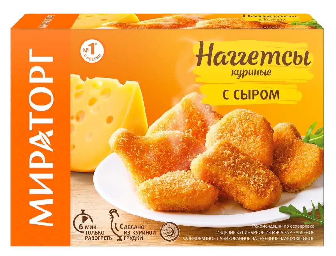 филе грудки кур замороженное, вода питьевая, сухари панировочные ( мука пшеничная, вода питьевая, соль, дрожжи, куркума, краситель аннато, эмульгаторы (моно- и диглицериды жирных кислот, эфиры глицерина и диацетилвинной и жирных кислот)), продукт плавленый с сыром [вода питьевая, жир специального назначения (масла растительные рафинированные дезодорированные гидрогенизированные, переэтерифицированные (подсолнечное, рапсовое), крахмал картофельный, молоко сухое обезжиренное, комплексная пищевая добавка (эмульгаторы (полифосфат натрия, дигидропирофосфат натрия), регуляторы кислотности (цитрат натрия 3-замещенный, гидрокарбонат натрия), сыр (молоко пастеризованное, бактериальная закваска мезофильных молочнокислых бактерий, молокосвёртывающий ферментный препарат микробного происхождения), соль, ароматизатор, краситель каротины, регулятор кислотности лимонная кислота], масло растительное подсолнечное рафинированное дезодорированное, смесь панировочная (мука пшеничная, соль, загуститель гуаровая камедь, крахмал кар;
